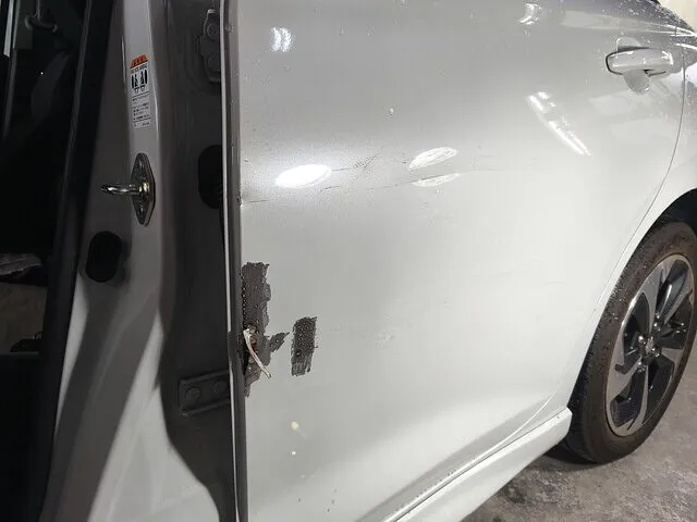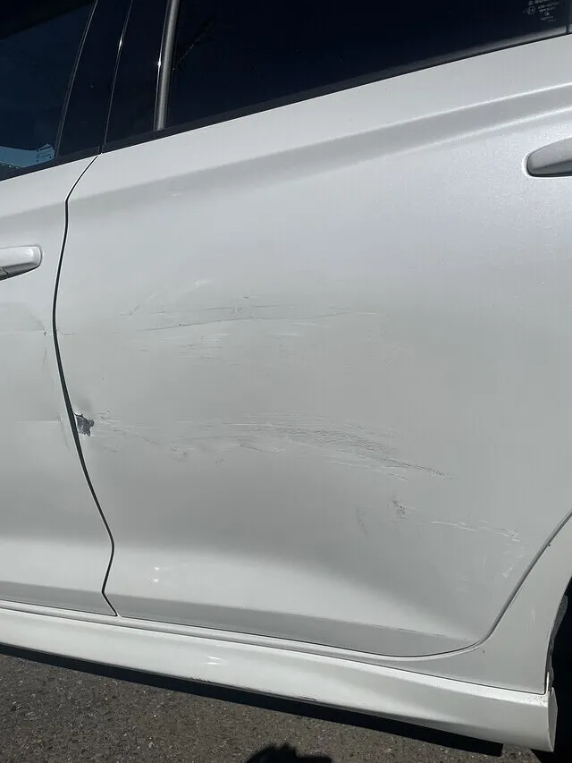 フロントからリアドアにかけてひっかくような形でぶつけたため、引っかかったリアドアのふちの部分が曲がっています。リアドアの平面も、何か所か広範囲にひずんでいます。