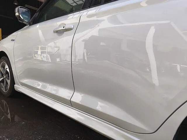 フロントドア、リアドアをこすってしまった際にできたへこみを伴う傷の板金塗装修理です。実費での修理なので、なるべく安い方法でという事で交換ではなく板金で修理します。