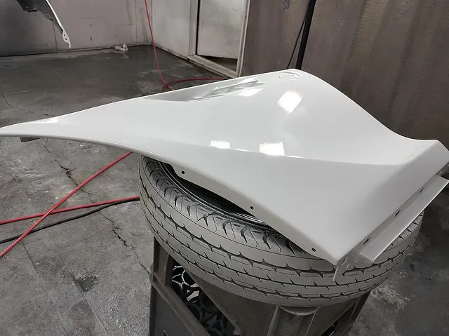 フロントバンパーとフロントフェンダーを塗装します。ソリッド色塗装の場合は割と色は決まりやすいですが、補修した場合など意外と下地が透けていることも多いので、きちんと隠ぺいできるまで薄く重ねることを意識します。比較的膜厚が厚くなる傾向にあるため、塗装垂れにも注意します。