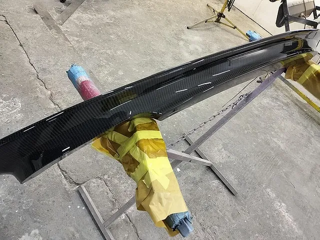 フロントバンパー下に取り付けるリップスポイラーの塗装をします。カーボン素材のためクリアーコーティングのみの塗装です。塗装が終わったらこちらも磨きをします。下地を出すと補修が利かないので慎重に・・