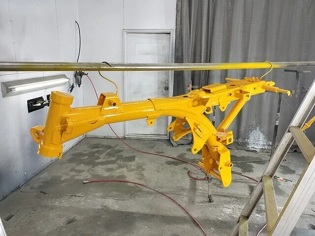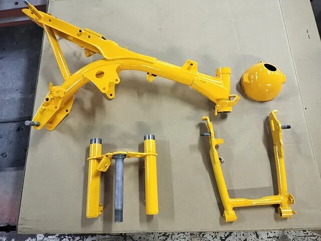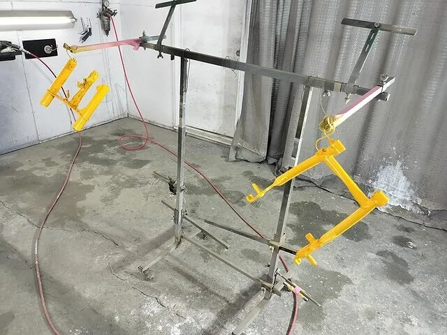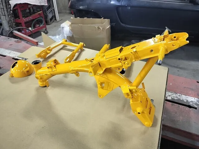 今回は黄色に塗装してほしいという事で、調色後にベースとなる黄色を塗装していきます。フレームの塗装はかなり複雑な形をしているので奥まで塗料を入り込ませるのに、非常に気を遣います。ガンのパターンを細くして奥まで塗装しますが、狙いすぎると周りがダラダラ垂れる、とてもシビアな塗装です。
