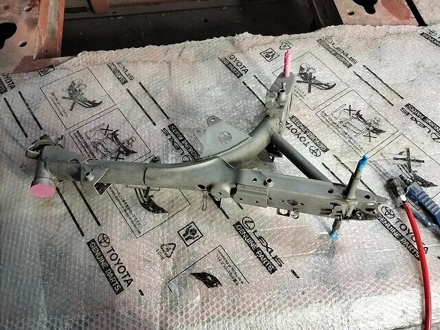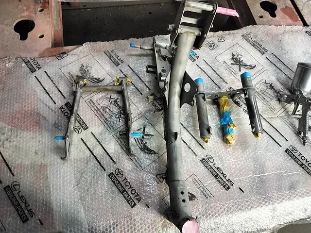 ブラストの砂が入ってはいけない場所を丁寧に養生して、フロントフォークやスイングアームもブラストをかけていきます。錆が発生している個所も多々あるので、細かな部分の塗装や錆落としは手作業ではやはり限界があります。
