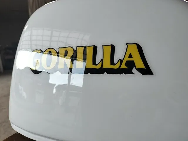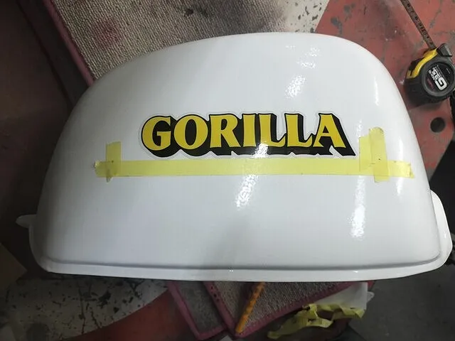 ベースを塗装し終えたらGORILLAロゴステッカーの貼り付けです。こちらは今回はお客様にご用意いただきました。位置出しの方法は様々ありますが、マスキングを貼り付けて左右上下からの均一な位置を出しました。貼り付けの際はゴミの付着に要注意です。